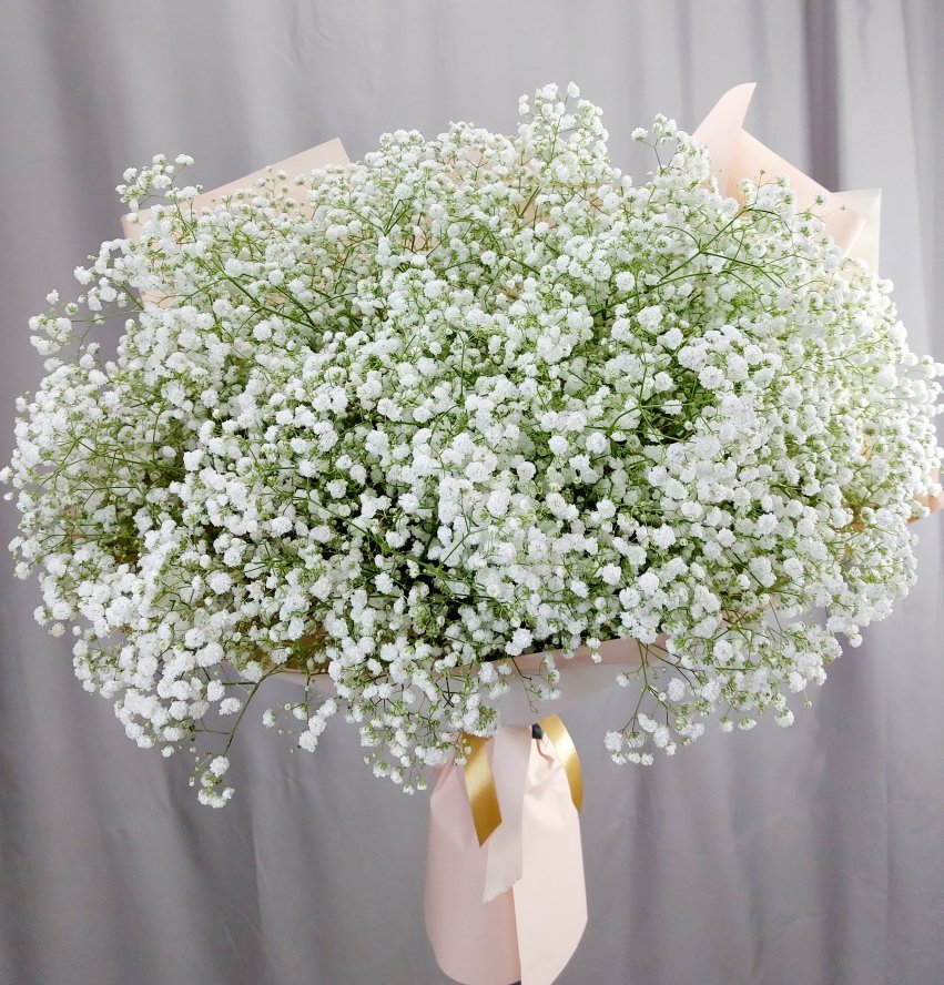 Описание Большой букет из гипсофилы, напоминает воздушное белое облако, очень красивый. Стойкие нежные соцветия. Маленькие цветочки белого цвета делают букет пышным.