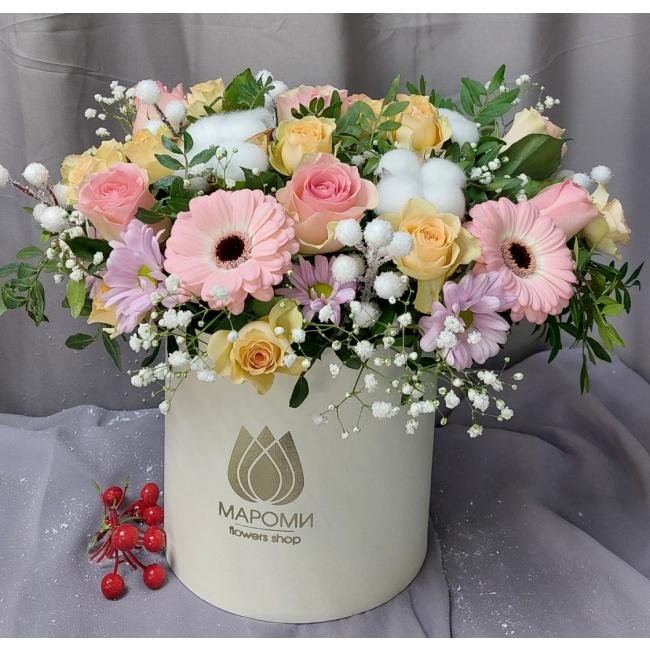 Описание Цветочные композиции подойдут на любой праздник, их часто заказывают в подарок любимым сёстрам, мамам, любой девушке, такая нежная, светлая композиция порадуют дорого тебе человека.
