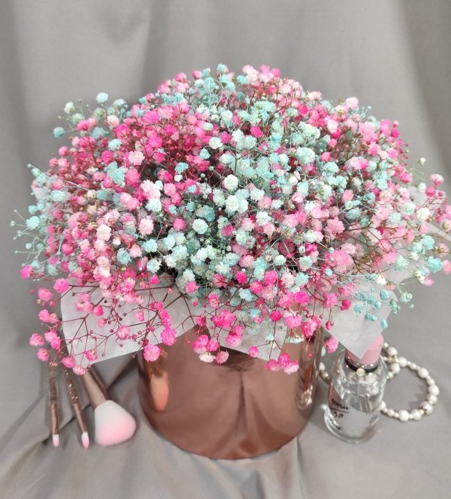 Описание Сочетание розовая и голубой гипсофила, очень красиво будет смотреться в любом уголке дома и подарит улыбку.