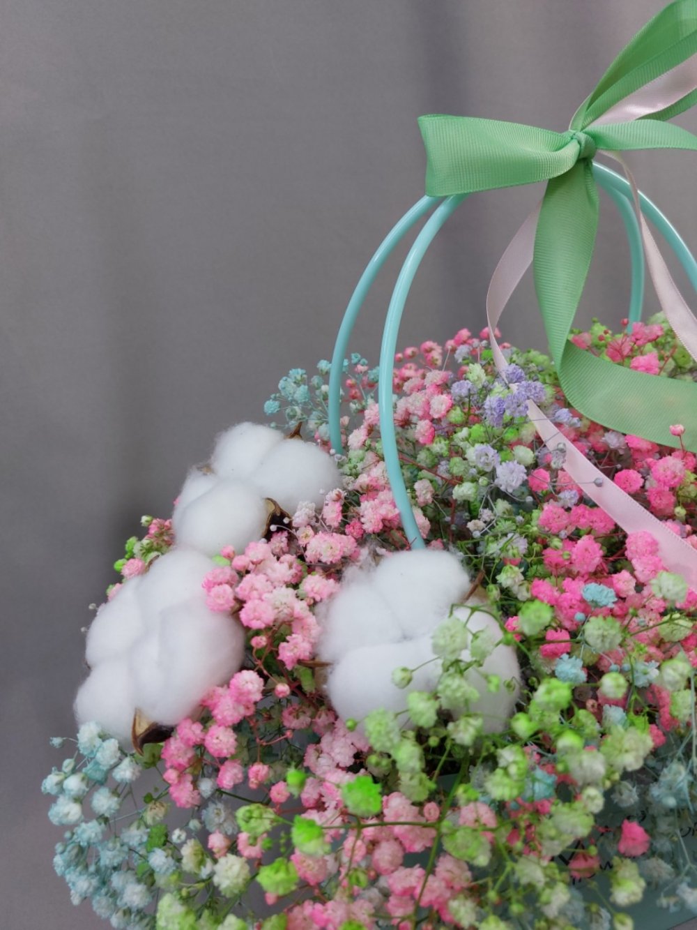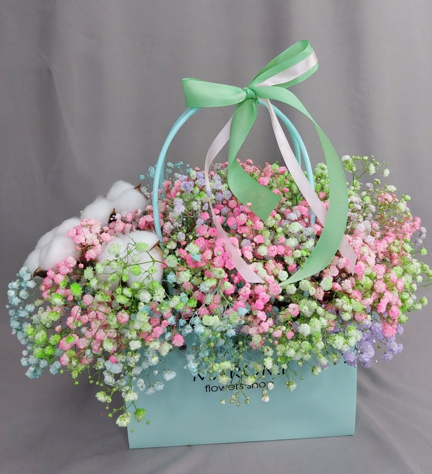 Описание Воздушная и изящная гипсофила, в радужных цветах, в стильной сумочке, стойкая композиция.