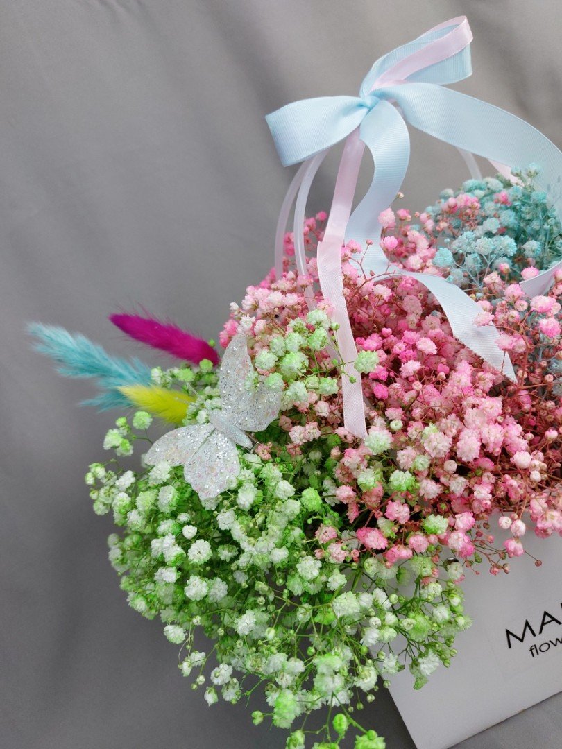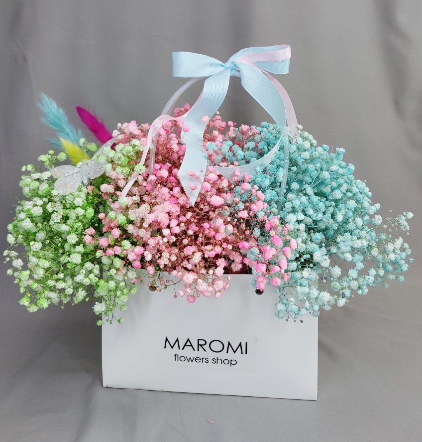 Описание Воздушная и изящная гипсофила, в радужных цветах, в стильной сумочке, стойкая композиция.