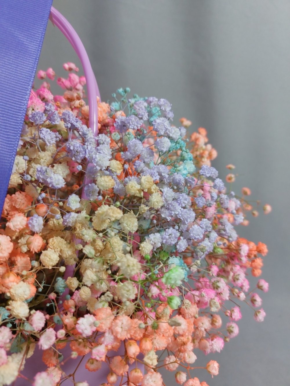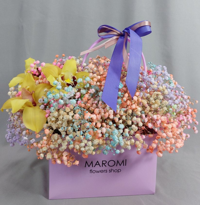 Описание Воздушная и изящная гипсофила, в радужных цветах, в стильной сумочке, стойкая композиция.