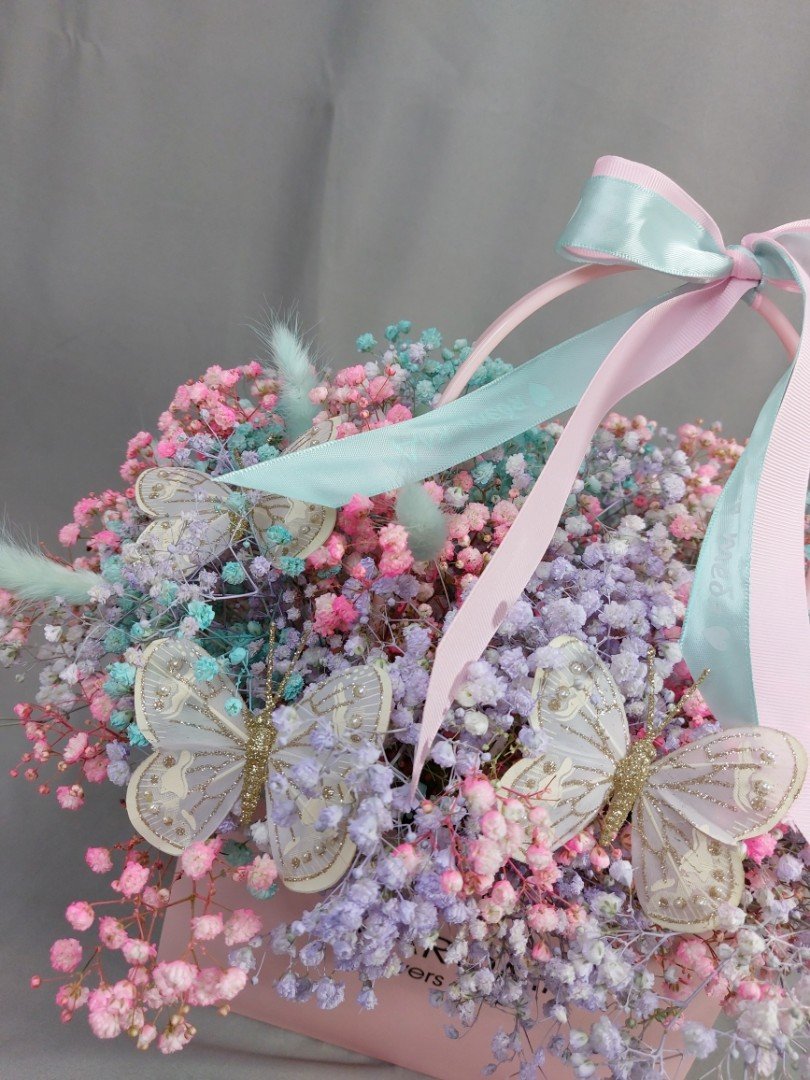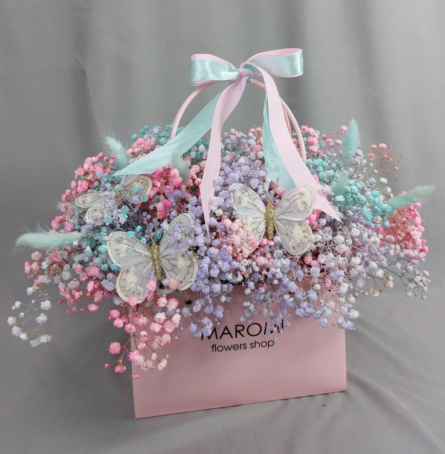 Описание Воздушная и изящная гипсофила, в радужных цветах, в стильной сумочке, стойкая композиция.
