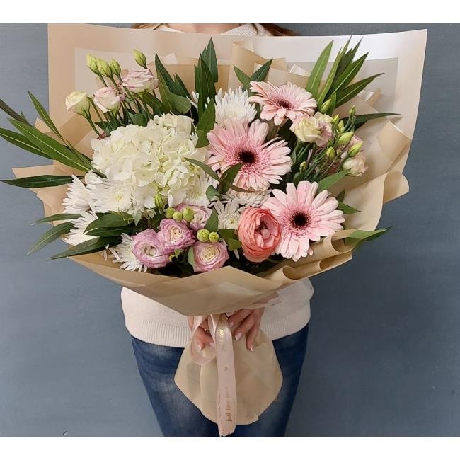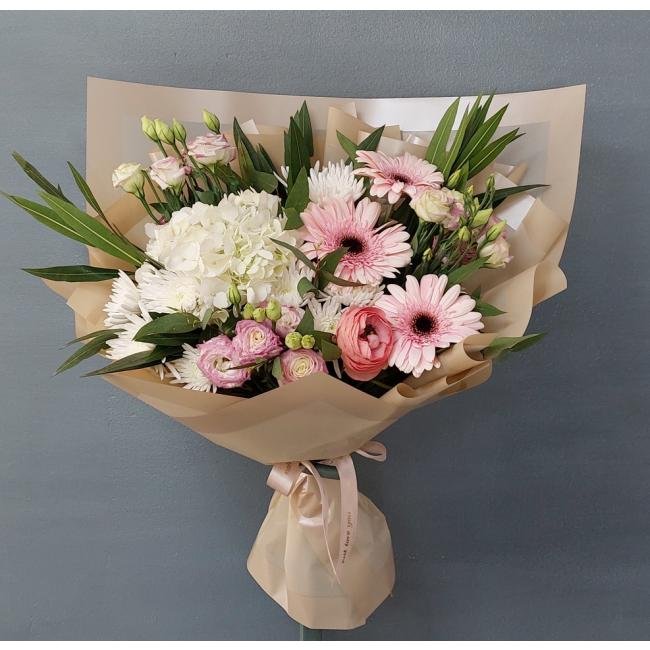 Описание Какой воздушный и лёгкий букет, белая гортензия как воздушное облачно, альпийская розочка в нежных тонах, прекрасное сочетание цветка и цвета.
