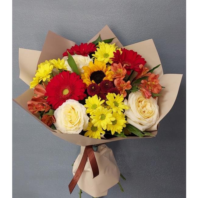 Описание Если душа подруги или родственницы просит яркого солнца, тепла и свободы, смело дарите букеты с тёплыми тонами и подсолнухами. Особенно, если лето выдалось дождливым.