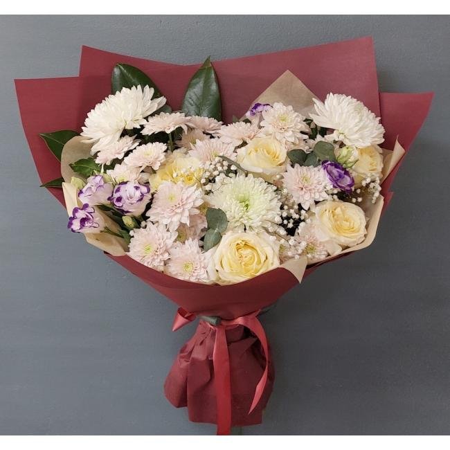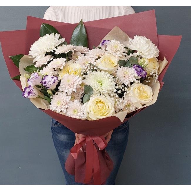 Описание Само воплощение трепетных чувств, легкости и нежности. Букет воплотил в себе теплоту и скромность кремовой розы, легкость и чувственность хризантемы.