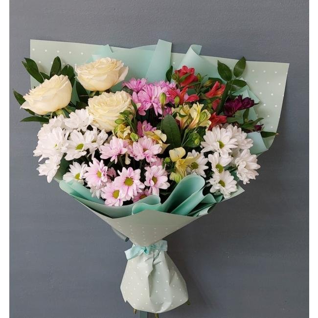 Описание Красочный жизнерадостный сборный букет, воплощённое совершенство вкуса - яркий подарок на любое торжество.