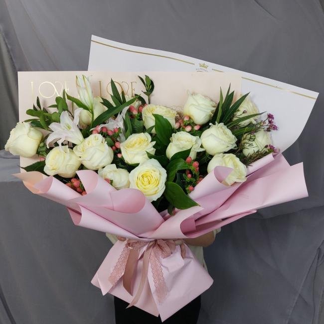Описание Нежный букет с пионовидными розами и утончённой лилией, подарят пленительный аромат получателю.