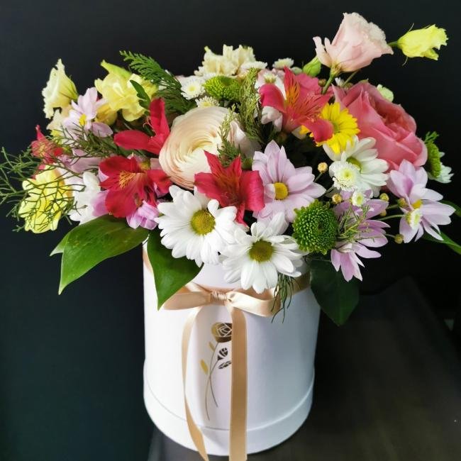 Описание Красочный композиция в шляпной коробке, будет еще долго радовать глаз!!!